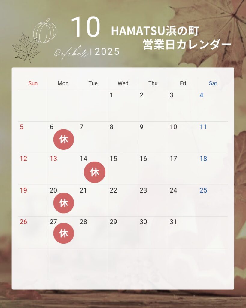 浜町店の10月の営業についてのお知らせ 投稿日 2025-10-06 著者 hamatsu カテゴリー NEWS カテゴリー 浜町店 浜の町店★10月の営業のついてのお知らせ ~営業時間~10:30-19:00 ~店内飲食~11:00-19:00 ~飲食ラストオーダー~18:00 店休日は月曜日です。月曜日が祝日の場合は営業し、火曜日が店休日となります。 ⚠︎︎お席のご予約は出来かねます。ご了承ください。 10月もみなさまのご来店お待ちしております